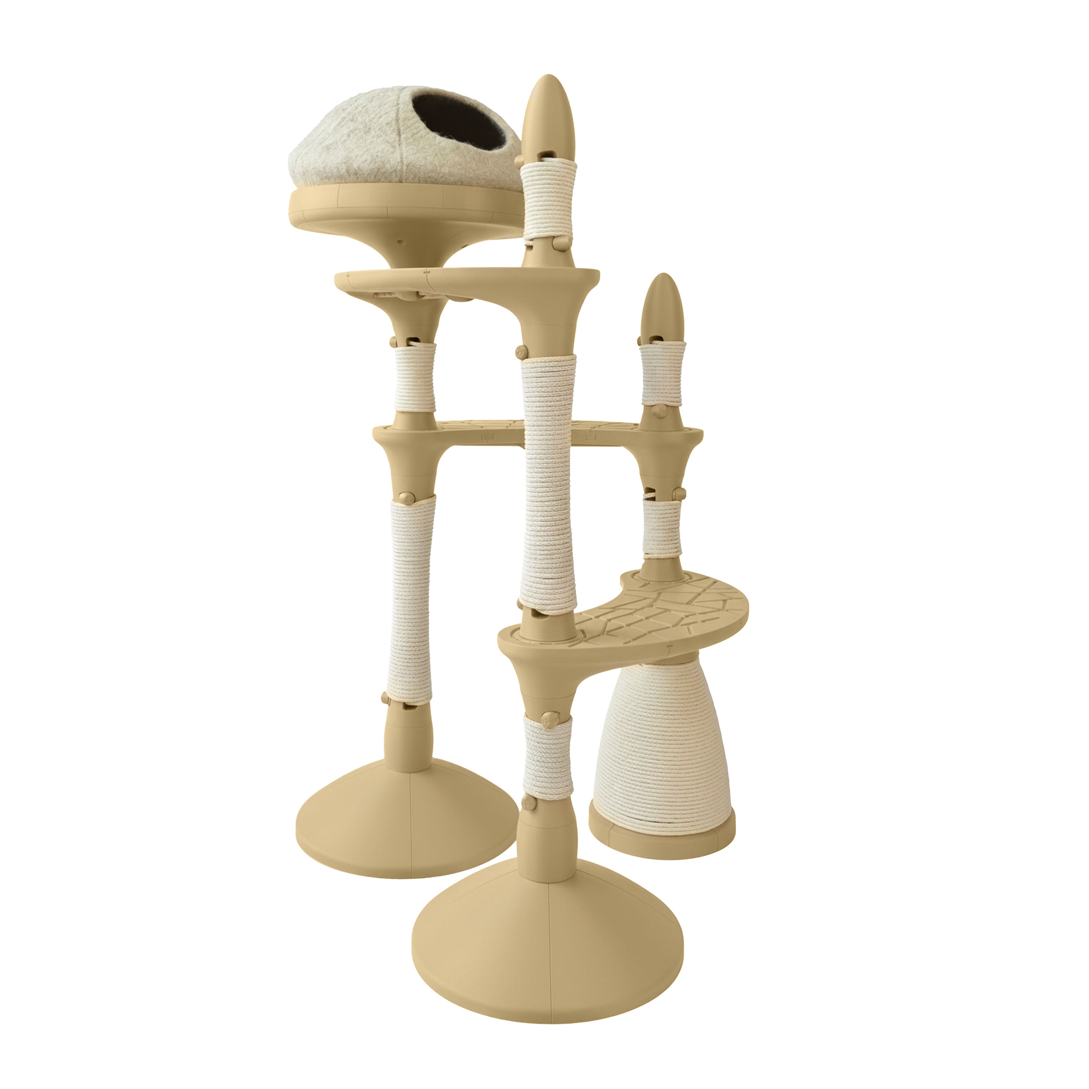 Aslan introduces defined vertical zoning across multiple tiers, giving cats purposeful pathways for movement, rest, and shared territory. A three-base structure supports active climbers and multi-cat households with ease, offering height and thoughtful spacing. The ideal mid-large tower when your cats need more levels, more room to climb, and a well-organized environment to explore together.